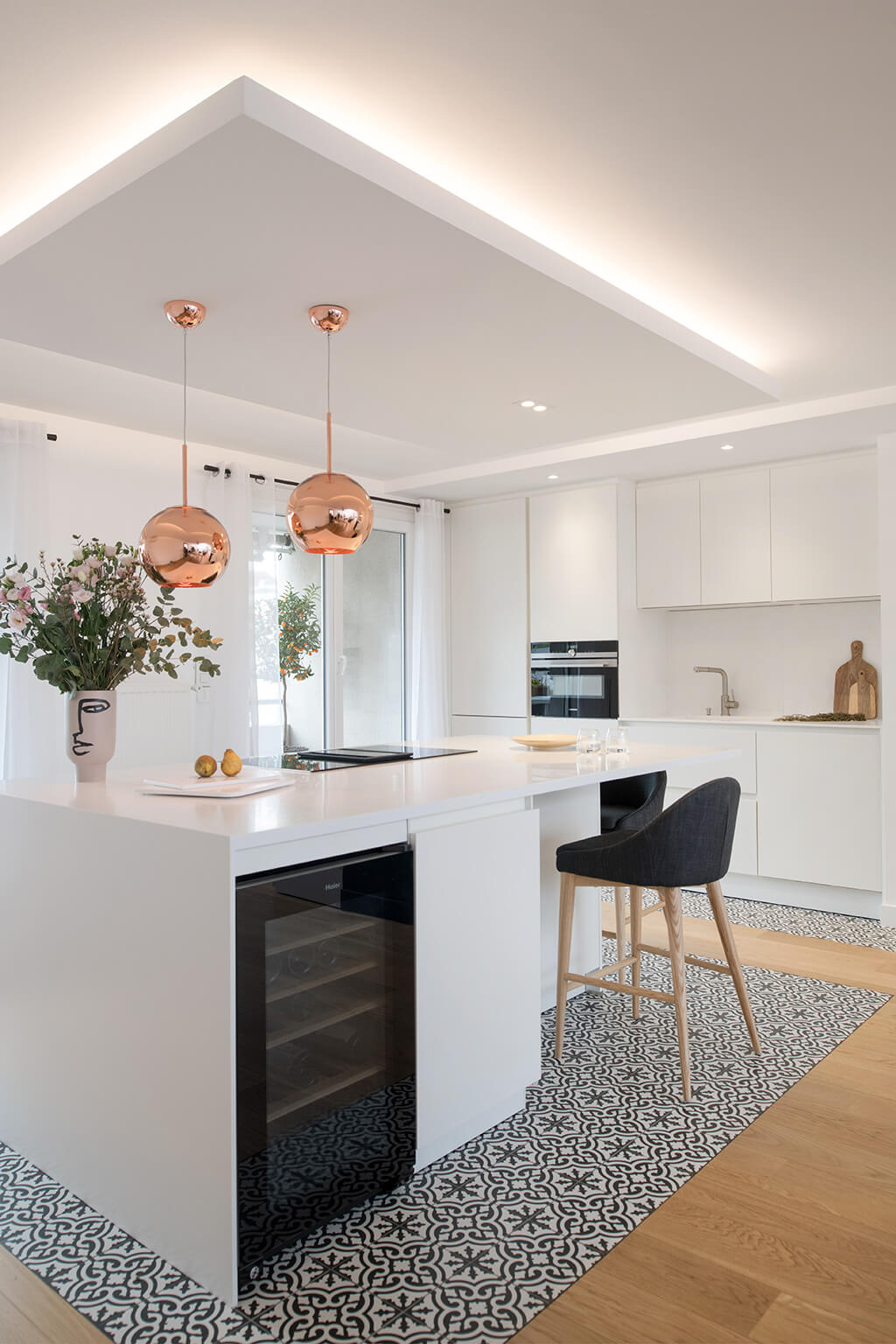 Le parti pris d'une cuisine toute blanche et très ouverte nécessitait de structurer les volumes par des jeux de faux plafonds, de calepinage fort mais aussi par une étude poussée de l’éclairage.