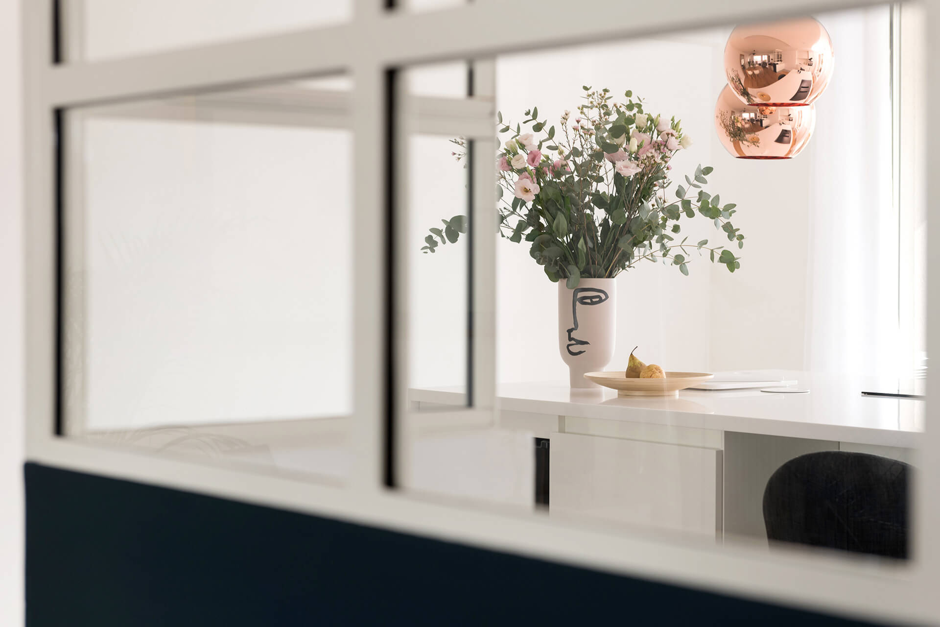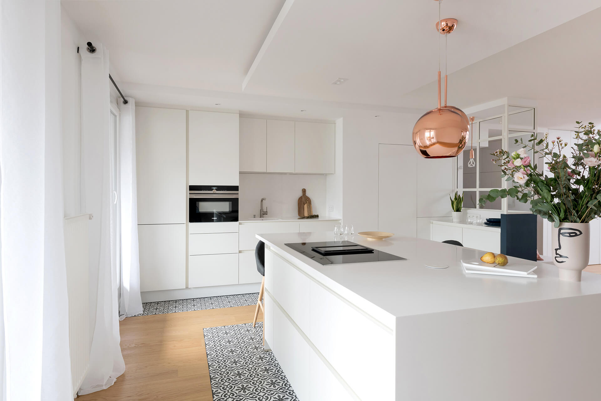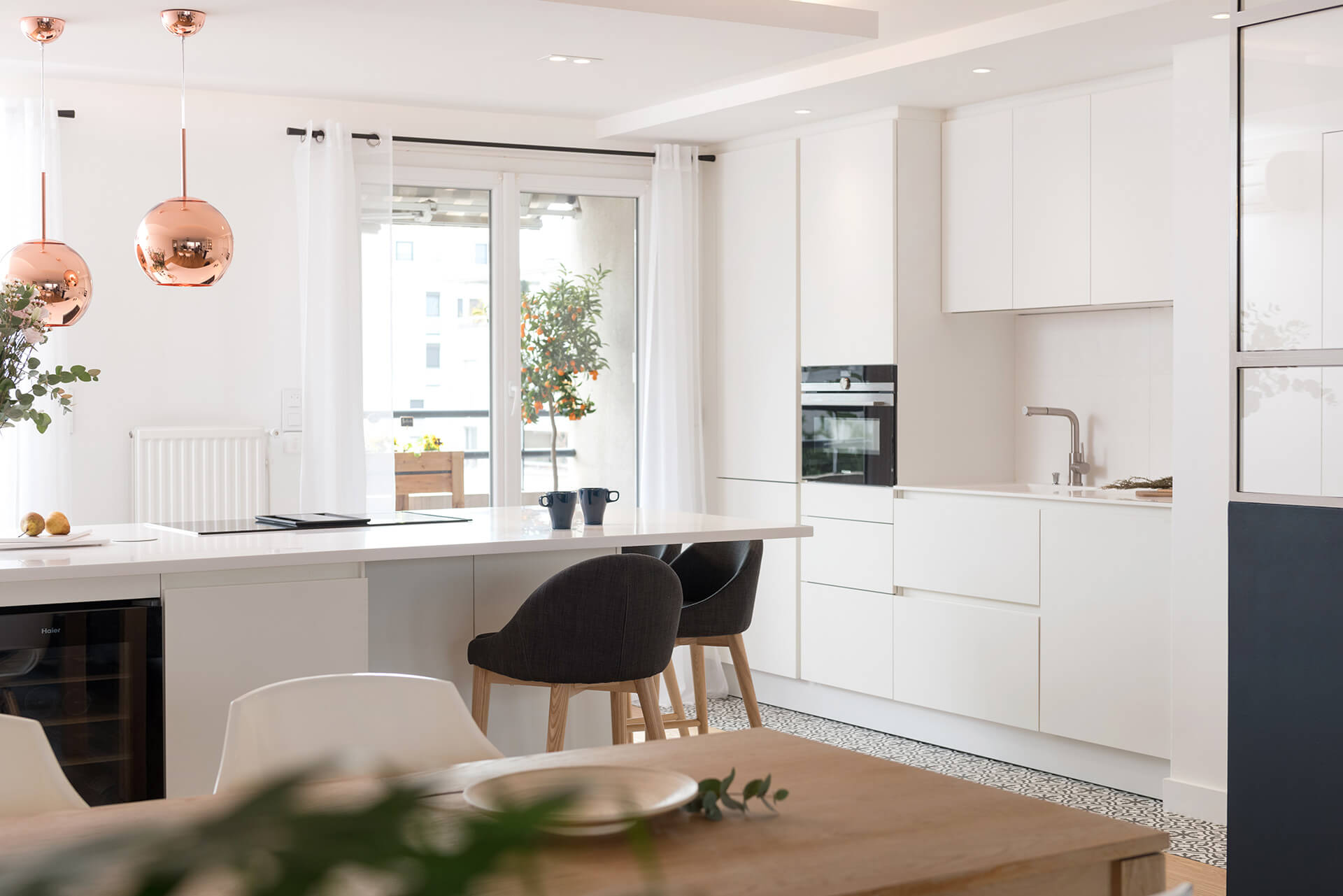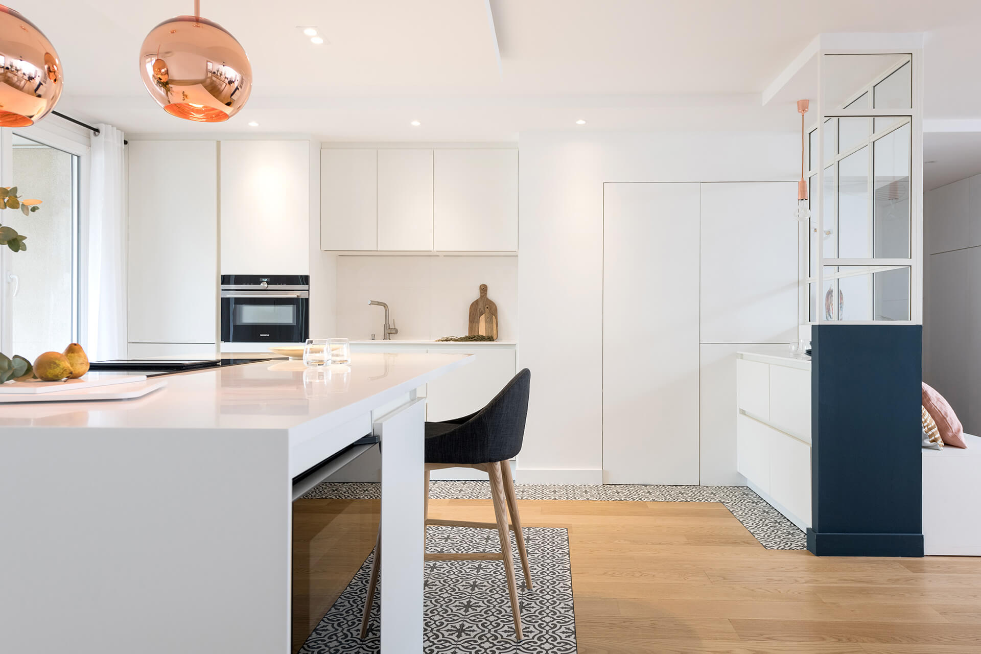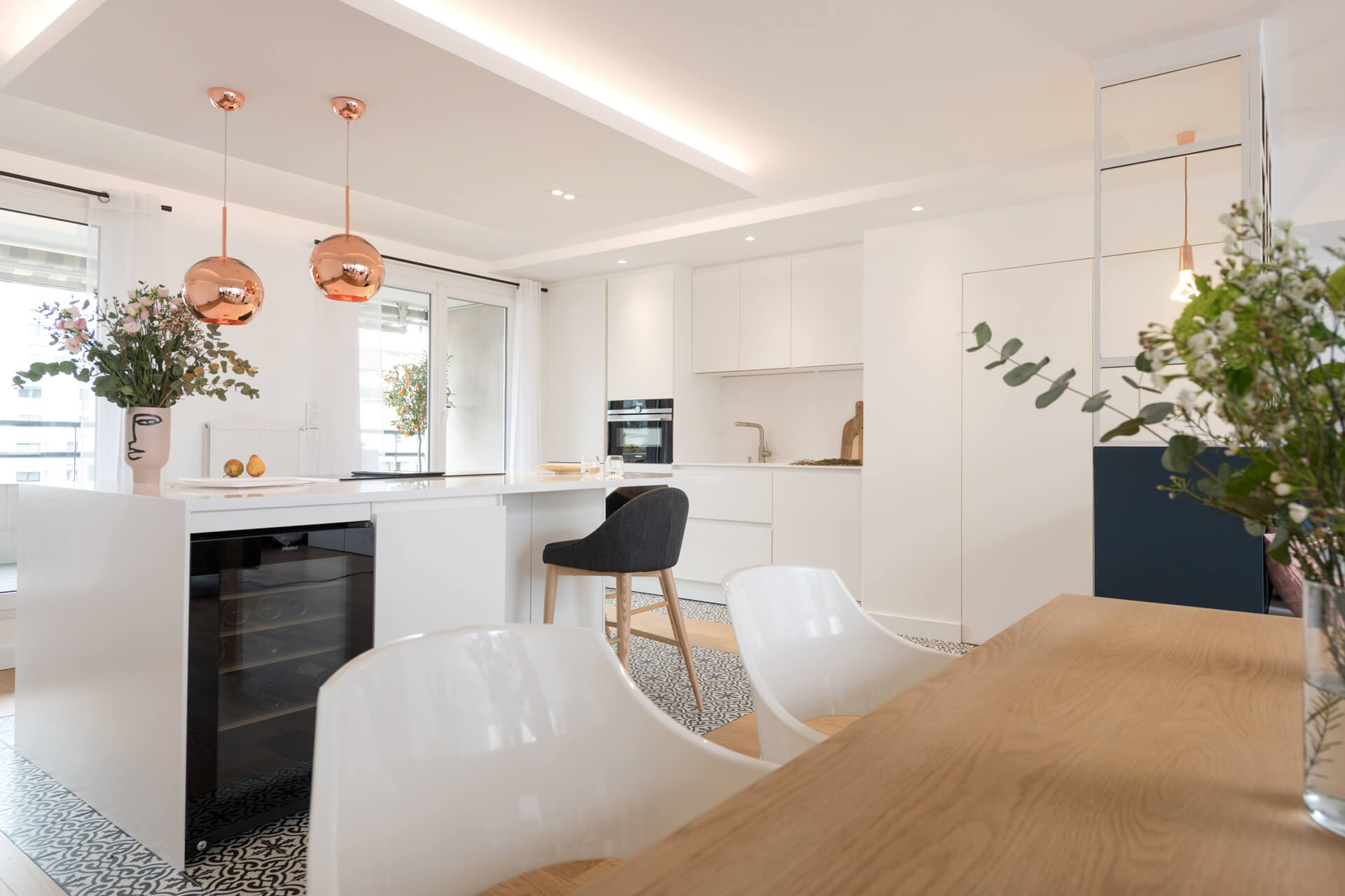 Le parti pris d'une cuisine toute blanche et très ouverte nécessitait de structurer les volumes par des jeux de faux plafonds, de calepinage fort mais aussi par une étude poussée de l’éclairage.