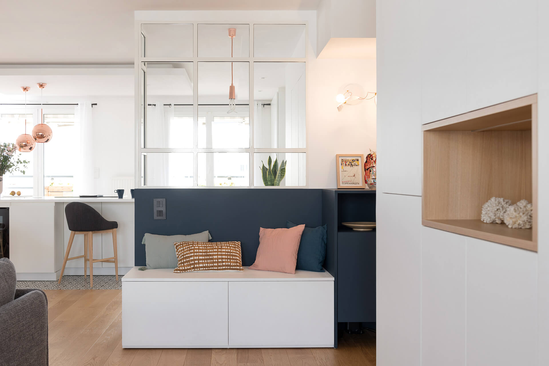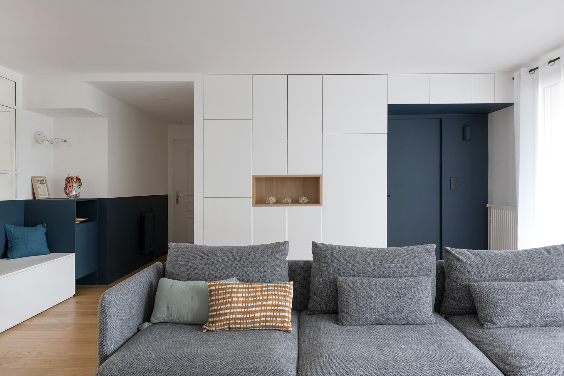 Entre ces deux espaces, un meuble multifonctions fut réalisé sur mesure et pensé aux exacts besoins de mes clients.