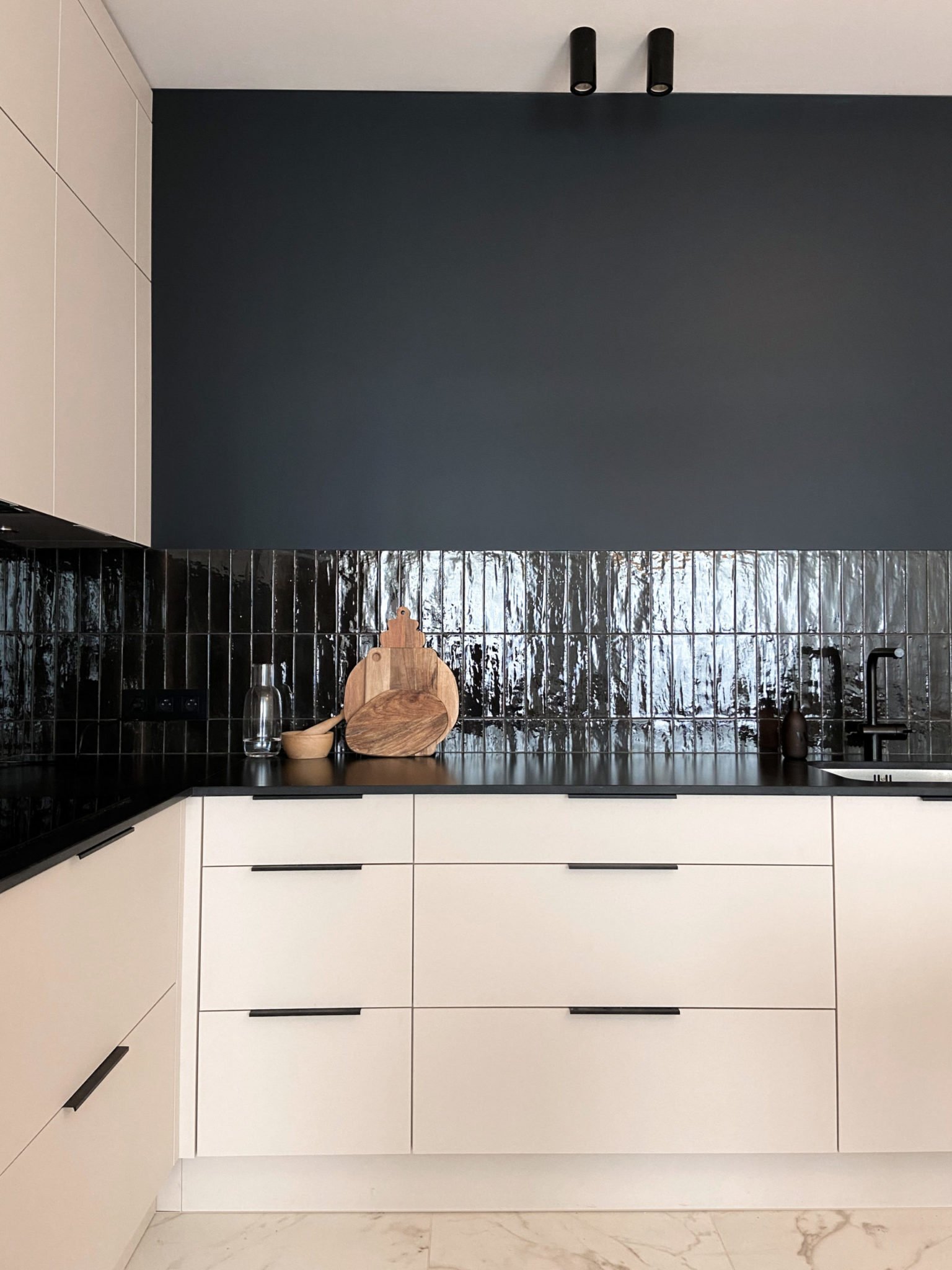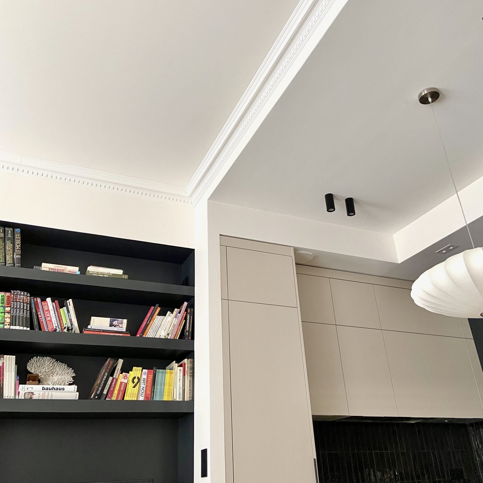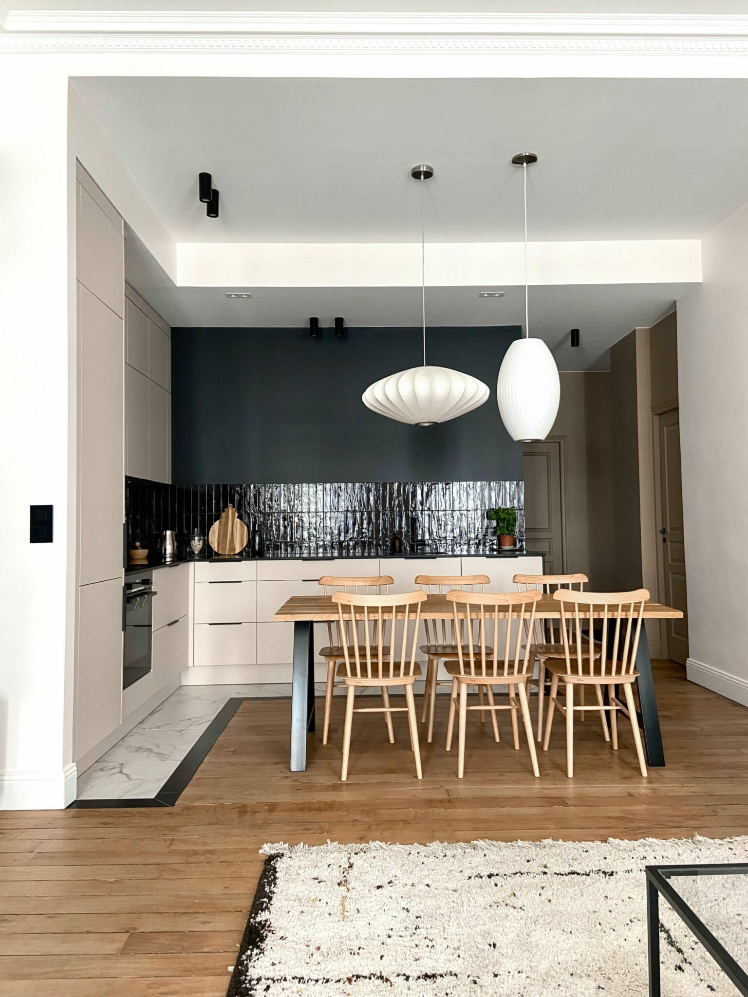 Des jeux de caissons et de faux plafond, un calepinage marbre souligné d'un listel noir et des zelliges dans la nouvelle cuisine très contemporaine, des perspectives en clair obscur...